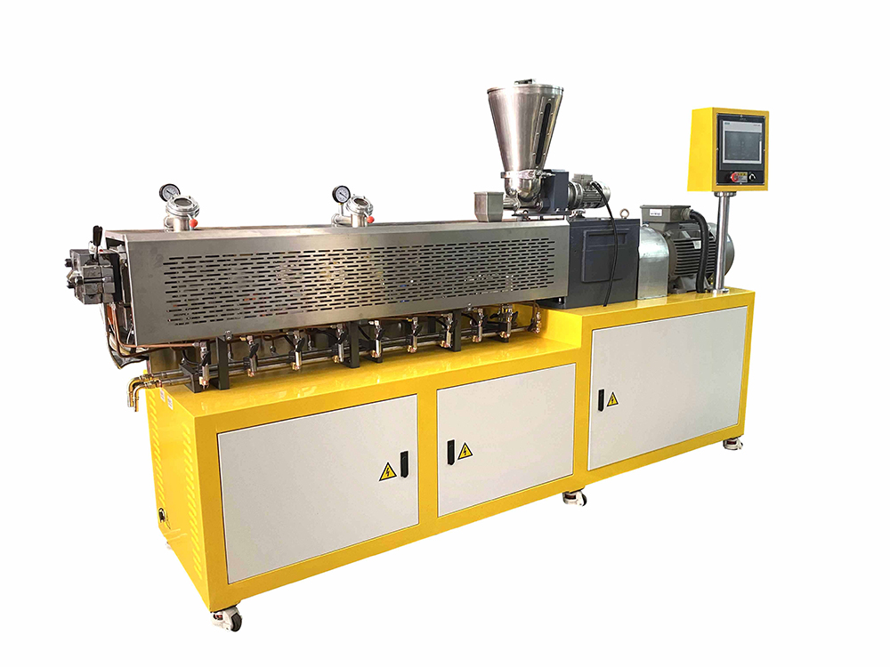 簡介:螺桿的連續轉動反復強迫物料轉向,有助于物料的均勻混合、塑化。在雙螺桿擠出機的加熱、混合,剪切、塑化、壓實排氣作用下,物料塑化成均勻的熔體,并在雙螺桿的擠壓下,通過機頭擠出圓形的條狀料,經冷卻水槽水冷后,再經切粒機切粒,得到塑膠粒料。本實驗采用水冷拉條冷切法。